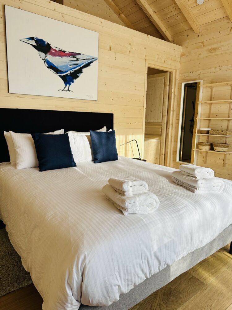 Entièrement habillée de bois de sapin du Jura, la chambre Le Nid offre un véritable havre de sérénité avec un grand lit confortable, une salle de bain privative, vue et accès direct au jardin.